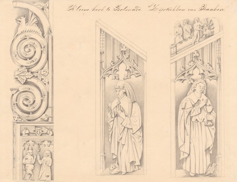 Gezicht op de zijstukken van banken in de Kleine of Broerekerk te Bolsward