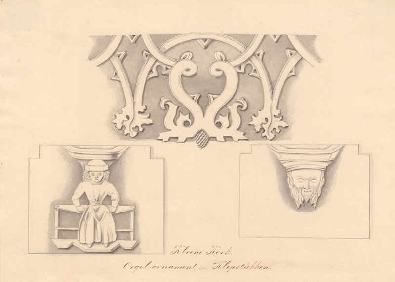 Gezicht op klepstukken van banken in de Kleine of Broerekerk te Bolsward