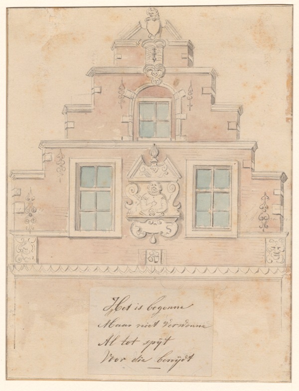 Gezicht op een bovengedeelte van een antieke gevel van een huis
