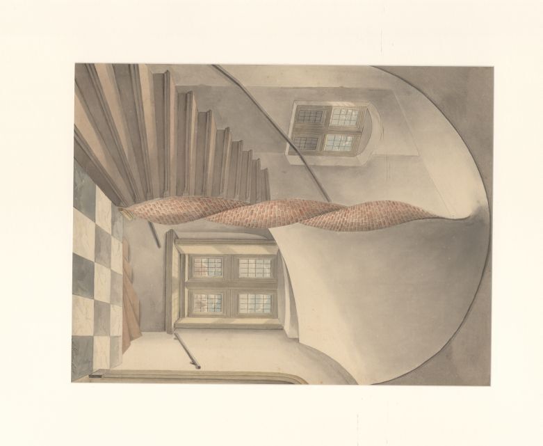 Gezicht op het voorportaal met wenteltrap van de voormalige Hottingha Stins te Franeker