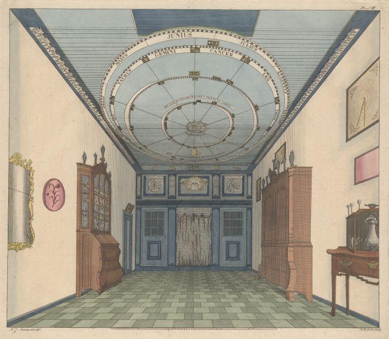 Gezicht met het bewegende planetarium van Eise Eisinga in zijn huis te Franeker
