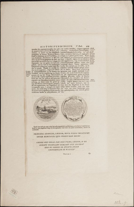 Historiepenning met wapenschild van Dokkum in een boek op bladzijde 419