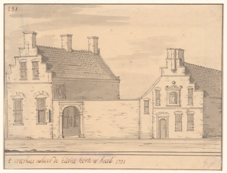 Gezicht op het Weeshuis achter de kleine kerk te Sneek