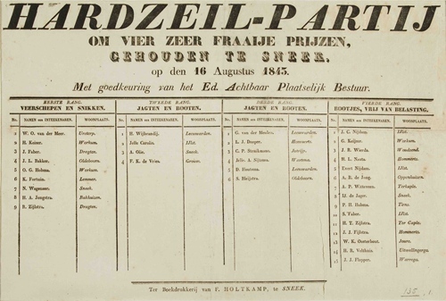 Hardzeilwedstrijd om vier zeer fraaije prijzen op den 16 augustus 1843