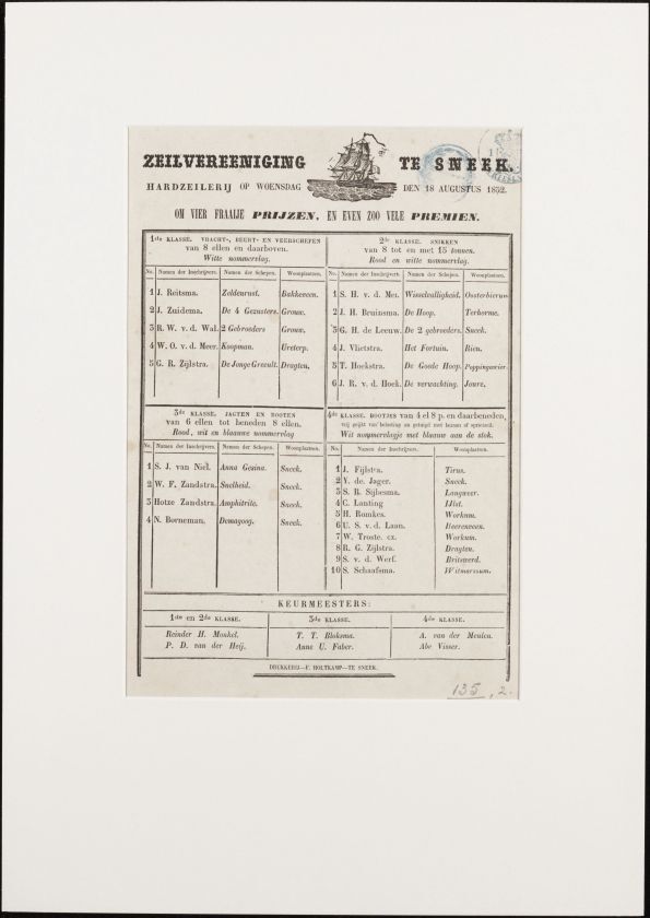 Hardzeilerij op woensdag den 18 augustus 1852 te Sneek om vier fraaije prijzen en even zoo vele premien
