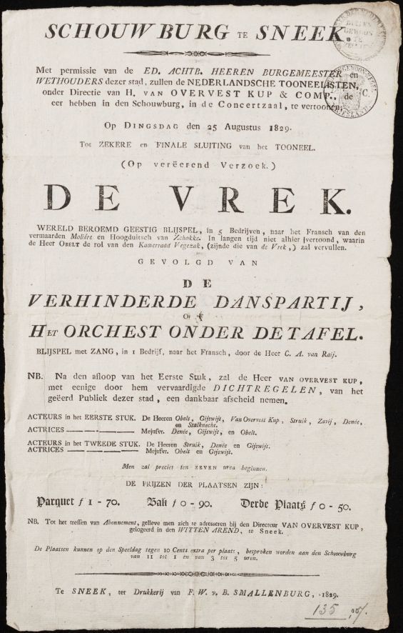 Programma voor de opvoering van De Vrede en De Verhinderde Danspartij of Het Orchest onder de tafel in de Schouwburg te Sneek op 25 augustus 1829