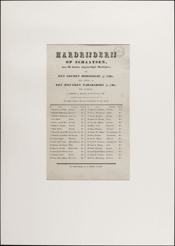 Hardrijderij op schaatsen door 32 daartoe uitgenodigde hardrijders te Sneek op maandag den 23 december 1844