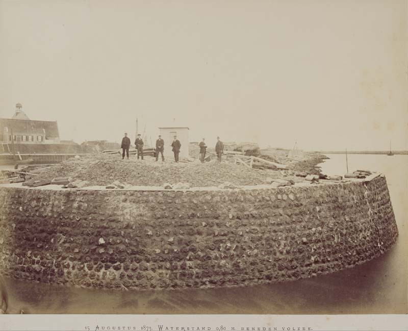 Havenwerken te Harlingen bij de kop van de buitenhaventond op 15 Augustus 1873