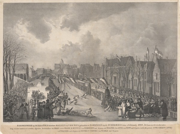 Hardrijderij op schaatsen tussen mannen en vrouwen op d Zuiderhaven te Harlingen op 4 Februari 1829