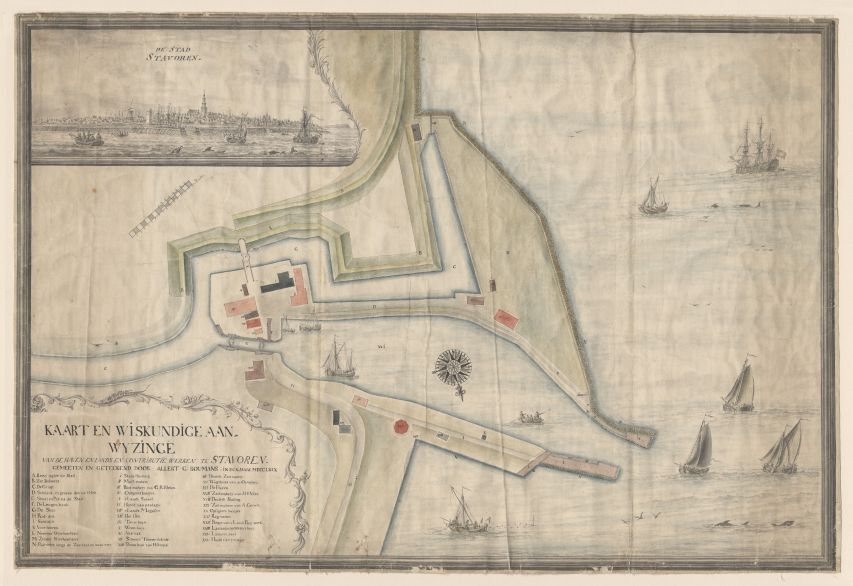 Gezicht op de stad Stavoren met een kaart van de haven en lands- en contributiewerken