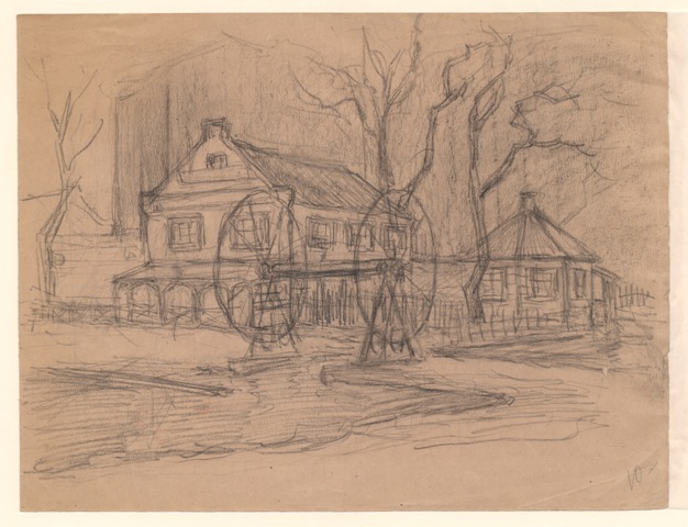 Gezicht op een huis met een galerij en rechts een theekoepel te Sloten