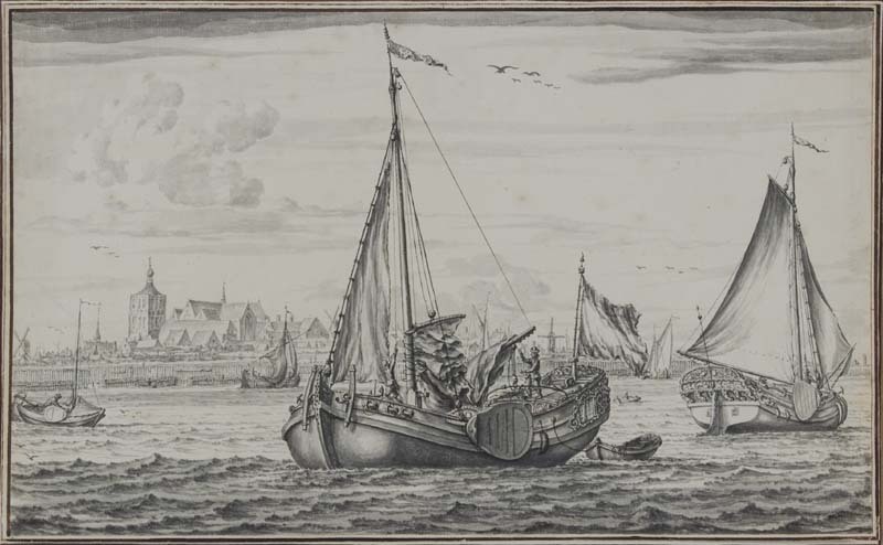 Gezicht op een Enkhuizer- en Fries jacht op zee bij Workum