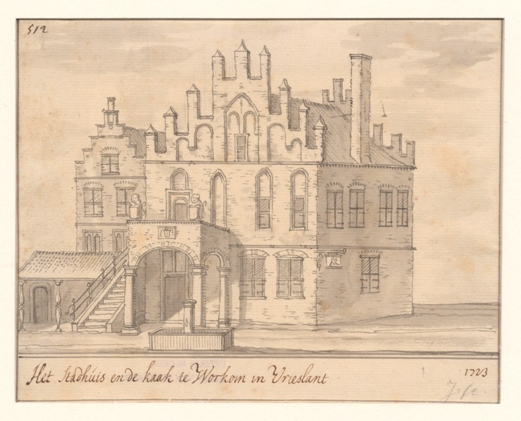 Gezicht op het stadhuis en de kaak te Workum
