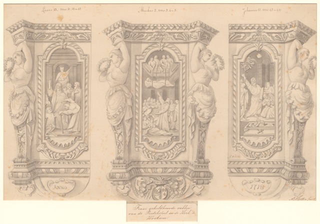 Gezicht op gebeeldhouwde vakken van de Preekstoel in de kerk te Workum