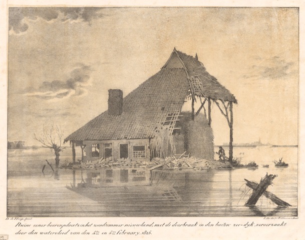 Ruïne van een boerderij in het Workumer Nieuwland tijdens de watersnood in 1825