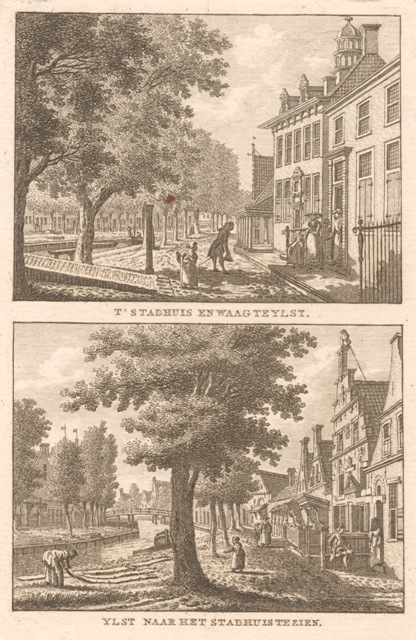 Gezicht op IJlst naar het stadhuis en de waag te zien