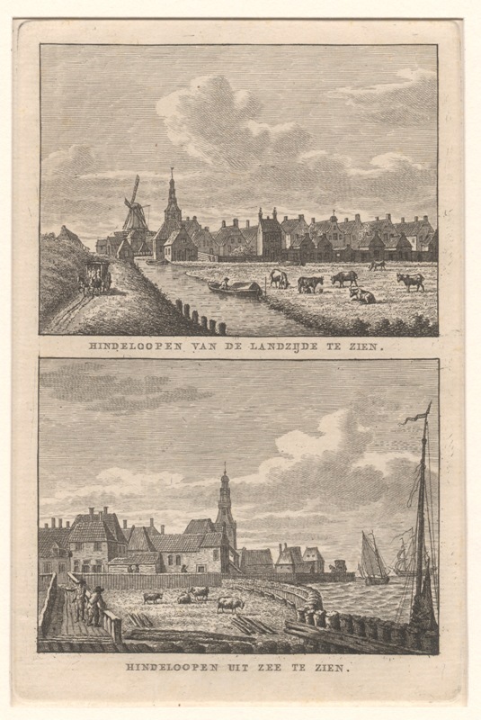 Gezicht op Hindeloopen van de landzijde en vanuit de zee