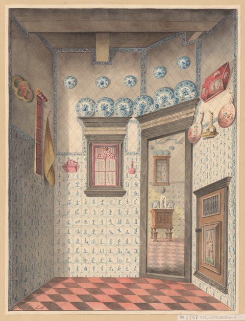 Gezicht op het voorportaal van de Hindeloper kamer op de Historische Tentoonstelling van Friesland in 1877