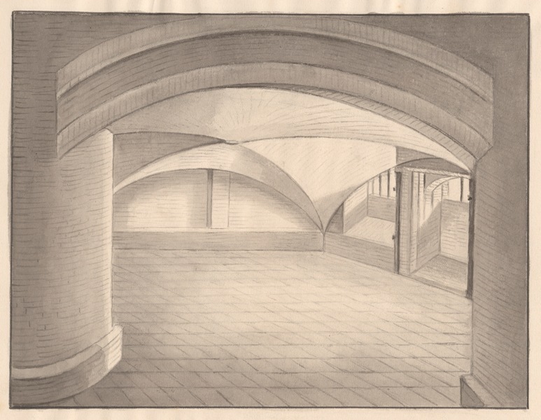 Gezicht op de kelder met gemetselde gewelven in Wiarda State te Goutum