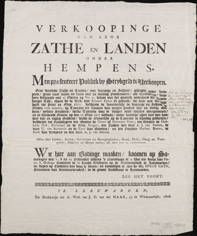 Verkoopinge / van eene / zathe en landen / onder / Hempens