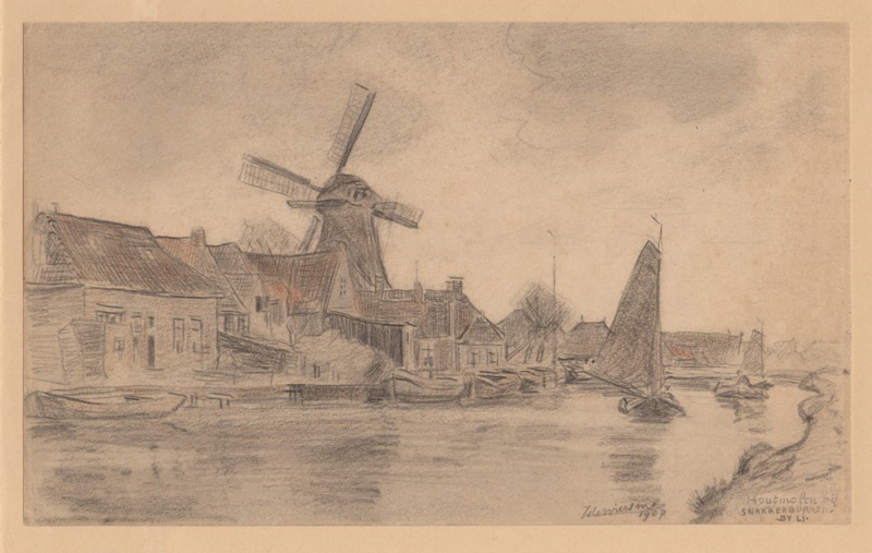 Gezicht op het dorpje en de houtmolen te Snakkerburen