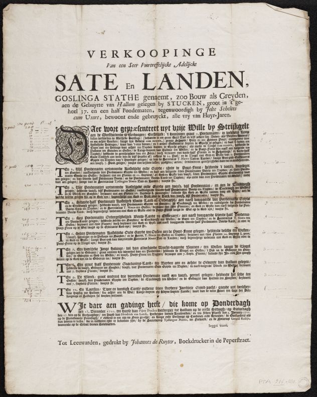 Verkoopinge / van een Seer Voortreffelijke Adelijcke / sate en landen / Goslinga Stathe genaamd
