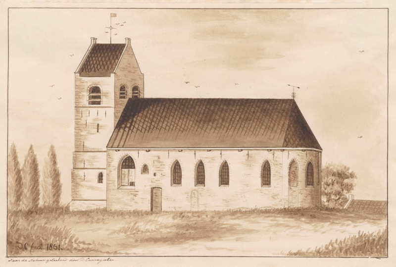 Gezicht op de kerk met stompe toren te Hegebeintum