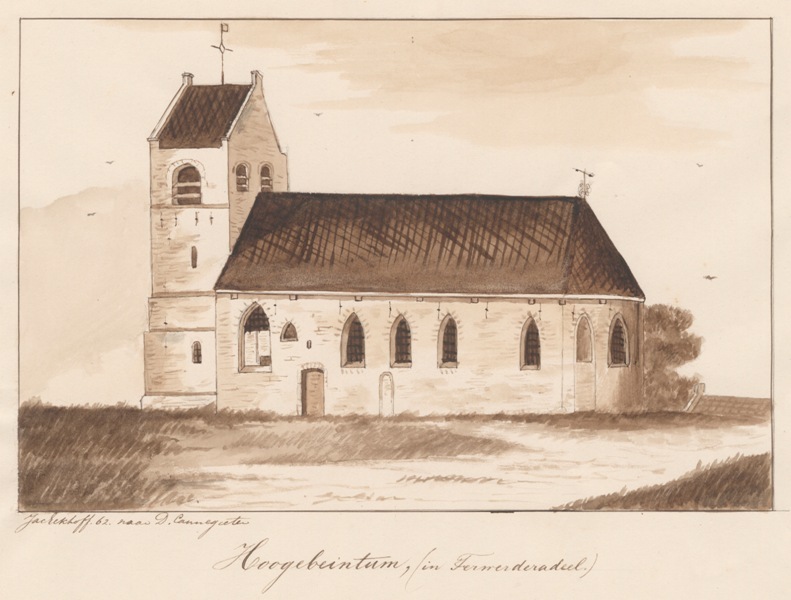 Gezicht op de kerk met stompe toren te Hogebeintum