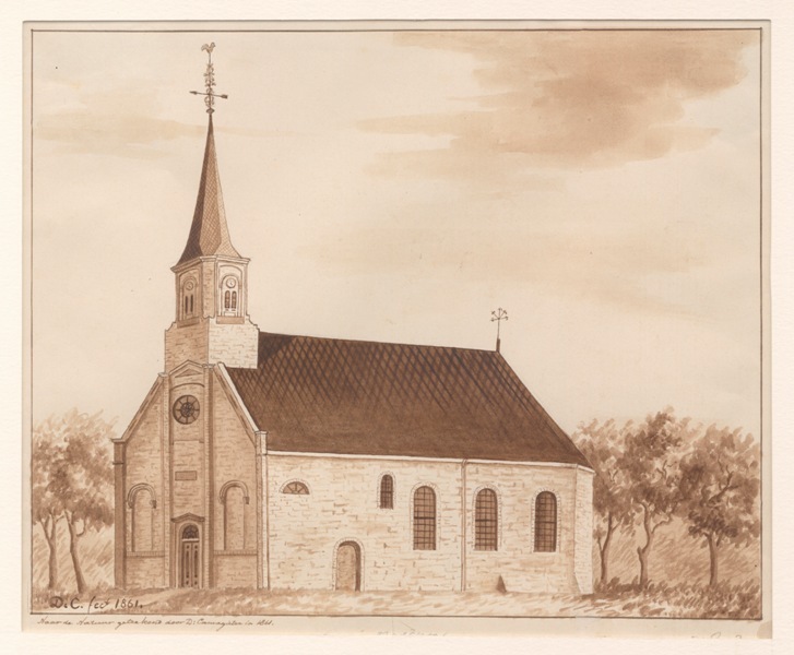 Gezicht op de kerk met spitse toren te Marrum