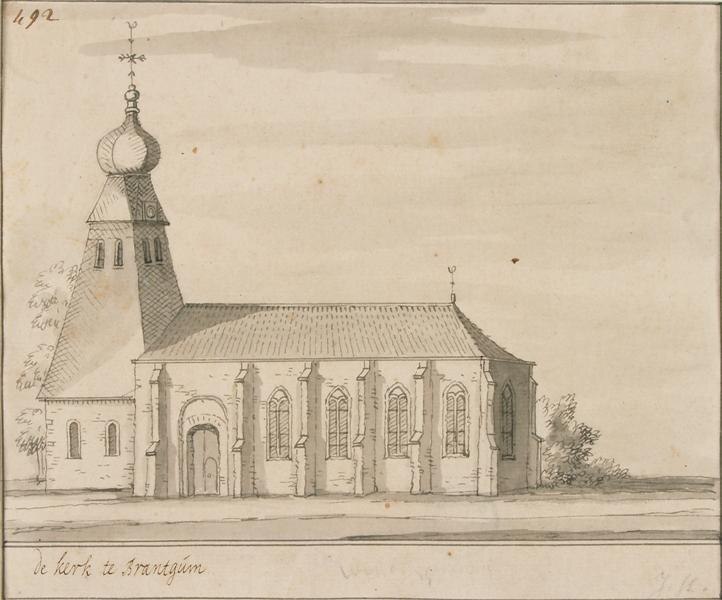 Gezicht op de kerk met spitse toren te Brantgum in West-Dongeradeel.