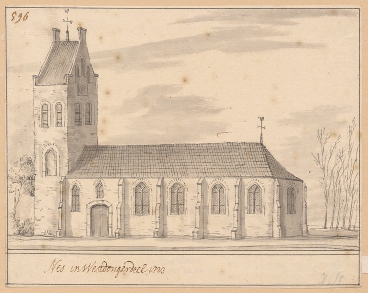 Gezicht op de kerk met stompe toren te Nes in West-Dongeradeel