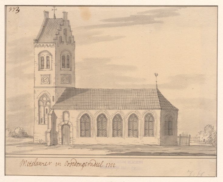 Gezicht op de kerk met stompe toren te Metslawier in Oost-Dongeradeel