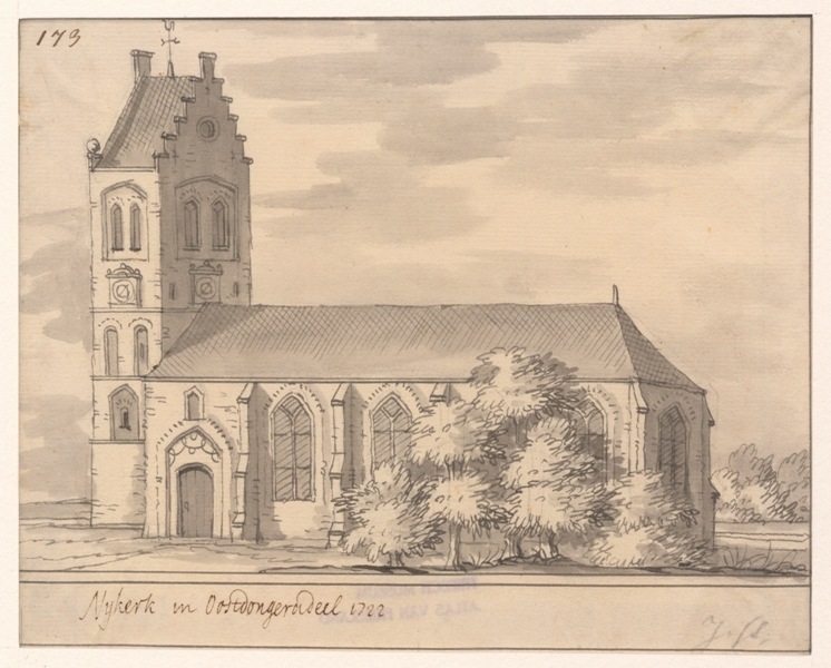 Gezicht op de kerk met stompe toren te Nijkerk in Oost-Dongeradeel