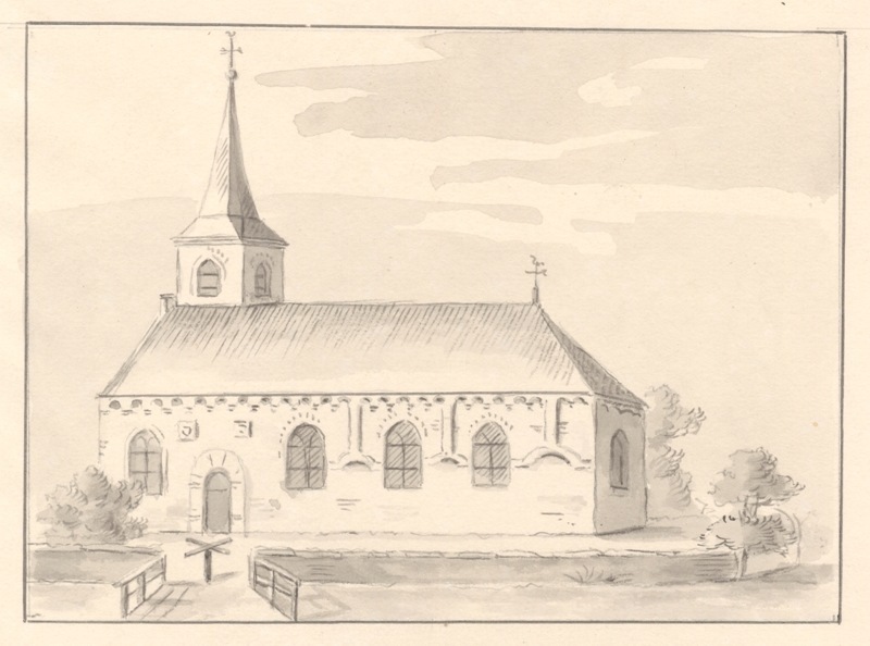 Gezicht op de kerk met spits torentje te Burum in Kollumerland