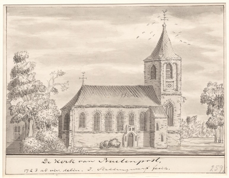Gezicht op de kerk met spitse toren te Buitenpost in Achtkarspelen