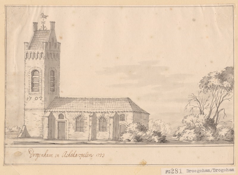 Gezicht op de kerk met stompe toren te Drogeham in Achtkarspelen
