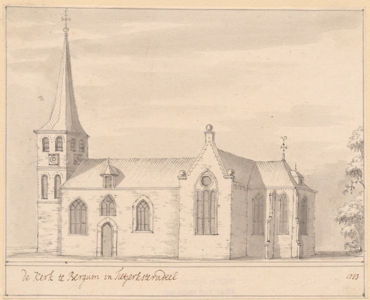 Gezicht op de kerk met spitse toren te Bergum in Tietjerksteradeel