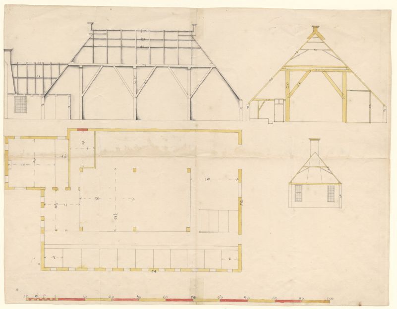 Aanzicht, balkconstructies en doorsnede van een huis of schuur