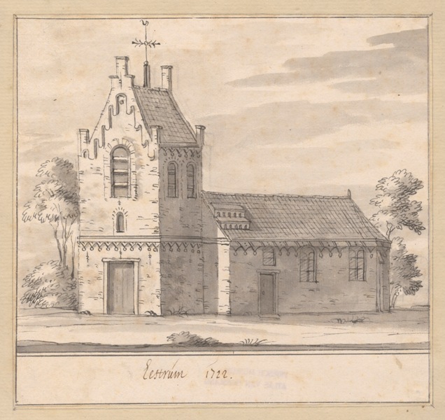 Gezicht op de kerk met stompe toren te Eestrum in Tietjerksteradeel