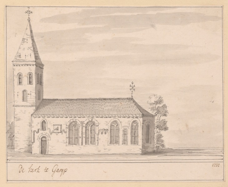 Gezicht op de ker met spitse toren te Garijp in Tietjerksteradeel
