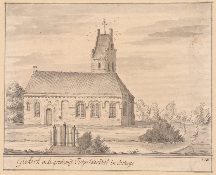 Gezicht op de kerk met stompe toren te Giekerk in Tietjerksteradeel