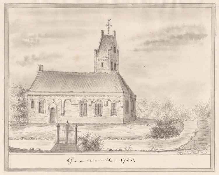 Gezicht op de kerk met stompe toren te Giekerk