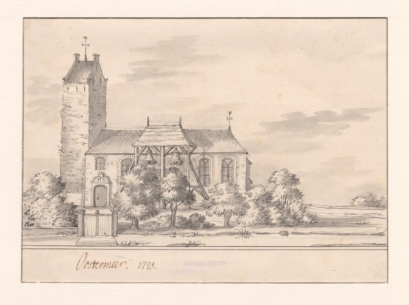 Gezicht op de kerk met stompe toren en klokstelling te Eastermar
