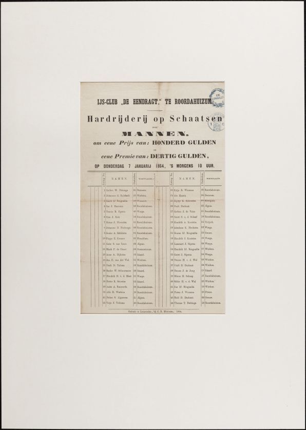 IJsclub De Eendracht te Roordahuizum. Hardrijderij op schaatsen door mannen op donderdag 7 januari 1864