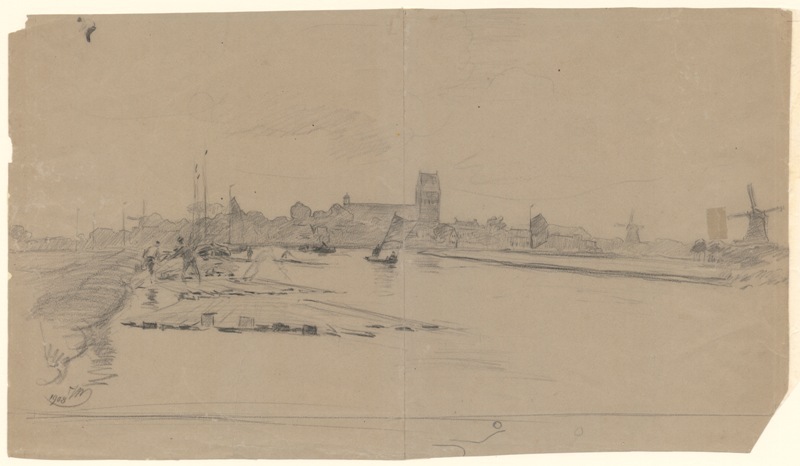 Gezicht op het dorp Grou met houtvlot en molen op de voorgrond
