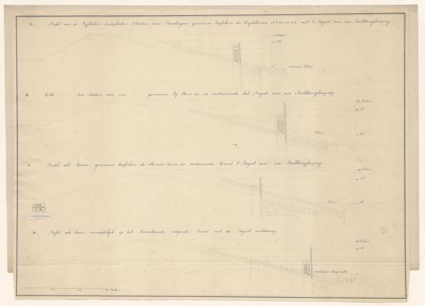 Een van drie bladen met profiel van de Vijfdeelen Zeedijken ten noorden en ten zuiden van Harlingen