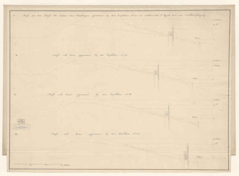 Een van drie bladen met profiel van de Vijfdeelen Zeedijken ten noorden en ten zuiden van Harlingen