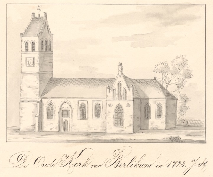 Gezicht op de kerk met stompe toren te Berlikum in Menaldumadeel