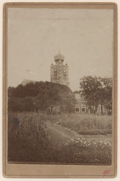 Gezicht op de toren van Deinum en een huis met in de deuropening Dr. H.F.Th. Ringnalda en C.E. Ringnalda