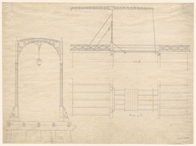 Aanzichten en plattegrond van een brug